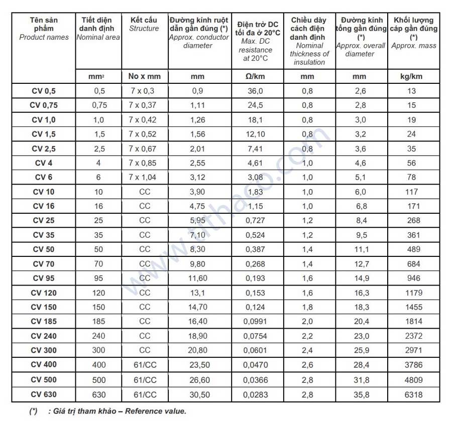 1. Công dụng: Cáp CV dùng cho hệ thống truyền tải và phân phối điện, cấp điện áp 0,6/1kV, lắp đặt cố định.